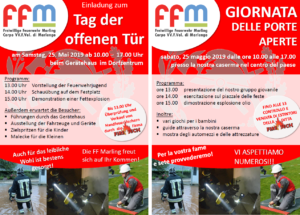 Am 4. Mai 2019 hat die Freiwillige Feuerwehr Marling das Fest ihres Schutzpatrons St. Florian gefeiert. Nach dem Einzug vom Oberwirt, begleitet von der Musikkapelle, fand der Festgottesdienst in der Pfarrkirche statt. Anschließend waren alle Feuerwehrleute und die Musikkapelle zu einem Abendessen ins Vereinshaus eingeladen.